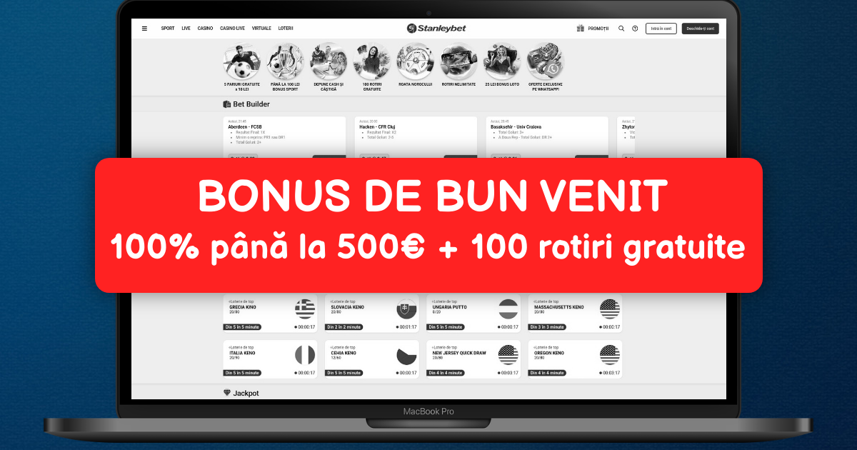 Bine ai venit la Stanleybet Casino, destinația supremă pentru pasionații de jocuri de noroc online din România! Stanleybet Casino îți oferă o colecție impresionantă de sloturi de la providerii preferați, jocuri live palpitante cu dealeri reali, premii fabuloase și bonusuri generoase la fiecare pas. Experiența ta de joc la Stanleybet Casino va fi întotdeauna sigură, distractivă și plină de surprize. Începe aventura chiar acum!